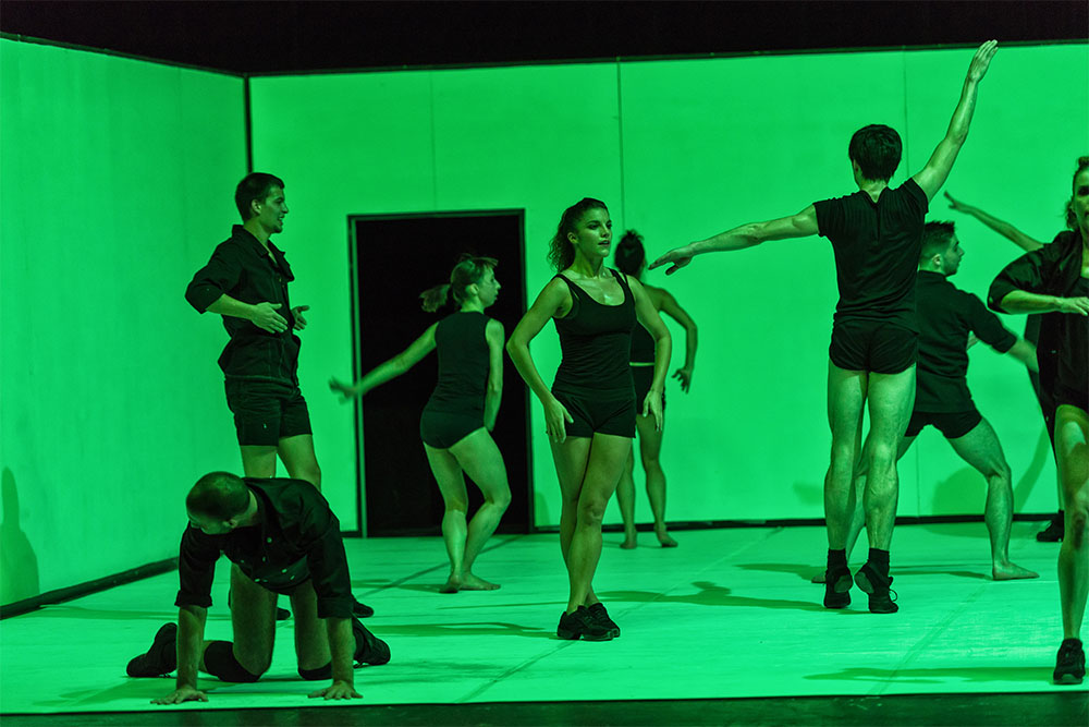 Les rires de EEEXEEECUUUTIOOOONS !!! entraînent une contradiction perverse : comment ces exercices physiques tortueux peuvent-ils apparemment inspirer un plaisir aussi irrépressible ? Mélangeant l’imagerie de la danse, l’exercice physique et sexuel au travail, la production à la répétition, la pièce renforce une longue tradition associant le rationalisme moderniste et la production capitaliste à la violence sadienne. Le chevauchement de la production, de la sexualité et du machinique est aussi largement représenté dans le vocabulaire de la danse du vingtième siècle ; rôdant dans l’ombre entourant EEEXEEECUUUTIOOOONS !!! nous pourrions saisir un bref aperçu des motifs de la répétition mécanique et l’auto-destruction du Sacre du printemps : la danse en tant que sacrifice humain.